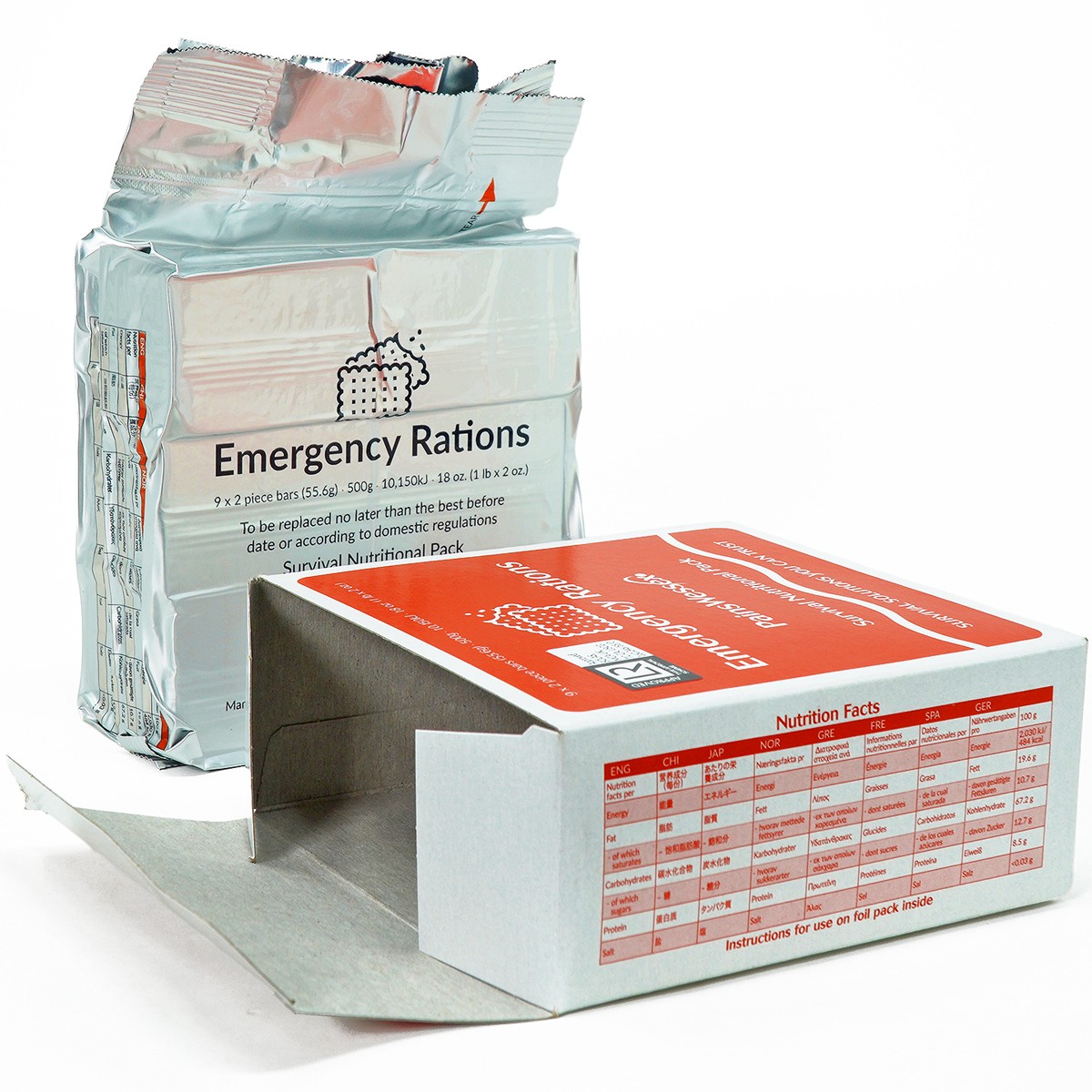 Το κουτί περιέχει εννέα μπάρες υψηλής ενέργειας, σφραγισμένες σε κενό αέρος σε αλουμινόχαρτο για να εξασφαλίζεται η μέγιστη φρεσκάδα. Κάθε συσκευασία ζυγίζει 500 γραμμάρια και παρέχει κατά μέσο όρο 10.150 kJ ενέργειας. Αυτό σημαίνει ότι κάθε μπάρα ζυγίζει 55,5 γραμμάρια και παρέχει 1125 kJ ενέργειας. Ανά 100 γραμμάρια, αυτό ισοδυναμεί με 2030 kJ. Η συσκευασία έχει ελεγχθεί διεξοδικά για αντοχή και έχει διάρκεια ζωής πέντε ετών.