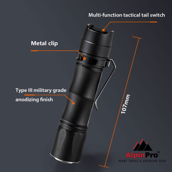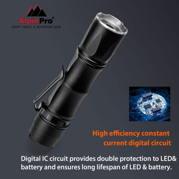 Υψηλής απόδοσης και εξαιρετικά αξιόπιστο κύκλωμα LED της ALPINPRO! Το οποίο παίζει σημαντικό ρόλο στην αποτελεσματική μεταφορά ενέργειας από την μπαταρία στο LED. Με αυτό επιτυγχάνεται εξαιρετική απόδοση και μεγάλη διάρκεια λειτουργίας σε σύγκριση με τα ανταγωνιστικά προϊόντα. Ενώ η πλειοψηφία των φακών και των ατομικών συστημάτων φωτισμού υποφέρουν από την σταθερή μείωση της φωτεινότητας κατά την διάρκεια της χρήσης, το συγκεκριμένο προϊόν με την εγκατάσταση αυτού του σύγχρονου κυκλώματος επιτυγχάνει την δυνατότητα να διατηρήσει την υψηλή απόδοση φωτισμού του μέχρι την εξάντληση της μπαταρίας.