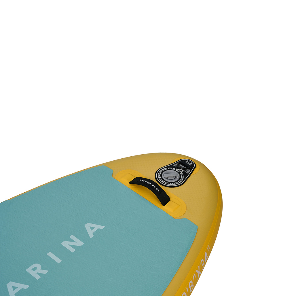 Το SUP DHYANA 10’8” Aqua Marina, είναι κατασκευασμένο από εξαιρετικά ανθεκτικό αλλά ταυτόχρονα ελαφρύ υλικό, με τεχνολογία drop stitch μικρού βάρους (DS light tech) για επιπλέον ακαμψία και ασφάλεια. Είναι ιδανικό για την ενδυνάμωση και εκγύμναση του μεγαλύτερου μέρους των μυών του σώματος, βελτιώνοντας παράλληλα την ισορροπία σας. Αν και το σχήμα καθώς και το στυλ του ακολουθούν τη γραμμή “All Around Sup” για την καλύτερη ολίσθηση επάνω στο νερό, στην πραγματικότητα κατατάσσεται στην κατηγορία “Yoga SUP”. Μπορείτε να κωπηλατήσετε στην επιθυμητή απόσταση από την παραλία και να εξασκηθείτε στην Aqua Yoga ή σε ασκήσεις Pilates επάνω στην ειδικά σχεδιασμένη γι’ αυτό το σκοπό σανίδα, ισορροπώντας στην επιφάνεια του νερού, γεγονός που κάνει ακόμη πιο “challenging” την όλη διαδικασία .