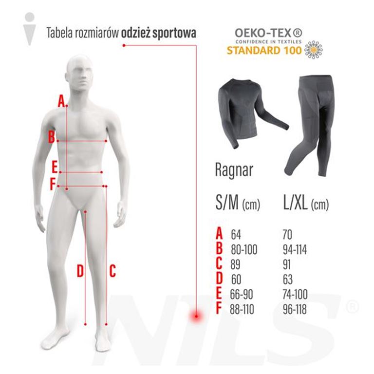 Τα ισοθερμικά εσώρουχα NILS RAGNAR είναι μια εξαιρετική λύση για κάθε άντρα που αγαπά να περνάει δραστήριο χρόνο όλο το χρόνο! Το μοντέλο Ragnar είναι ένα θερμικό σετ εσωρούχων που περιλαμβάνει μια μακρυμάνικη μπλούζα και ένα κολάν. Τα σετ είναι κατασκευασμένα από υλικό υψηλής ποιότητας: 92% POLYAMIDE, 2% POLYESTER και 6% ELASTANE, χάρη στα οποία εφαρμόζουν τέλεια στη σιλουέτα, προσφέρουν αίσθηση άνεσης αλλά το πιο σημαντικό, απομακρύνουν την υπερβολική υγρασία και θερμότητα . Διατηρεί το δέρμα σας στεγνό και τη βέλτιστη θερμοκρασία σώματος ακόμη και κατά τη διάρκεια χειμερινών σπορ ή απαιτητικών ορεινών πεζοποριών. Το μοντέλο Ragnar προσφέρει επίσης πρόσθετο υλικό στην περιοχή του μπροστινού καβάλου, ενισχύοντας με αυτόν τον τρόπο την ελευθερία κινήσεων του χρήστη. ΧΑΡΑΚΤΗΡΙΣΤΙΚΑ: Υλικό: 92% POLYAMIDE, 2% POLYESTER και 6% ELASTANE Grammage: 245 – 280 g/m2 OEKO-TEXreg; Standard 100 Το σετ περιλαμβάνει: Μακρυμάνικη μπλούζα: ναι κολάν: ναι Βάρος: 400 g (μέγεθος S/M) 490 g (μέγεθος L/XL) Προβλεπόμενη χρήση: Προβλεπόμενη χρήση: πεζοπορία υπαίθριο τρέξιμο χειμερινά σπορ ποδόσφαιρο ποδηλασία περπάτημα Size chart: Ragnar Btz0060 Στήθος (δες το Β στην εικόνα) Μέση (δες το Ε στην εικόνα) Γοφοί (δες το F στην εικόνα) S/M 80-100 cm 66-90 cm 88-110 cm L/XL 94- 114 cm 74-100 cm 96-118 cm