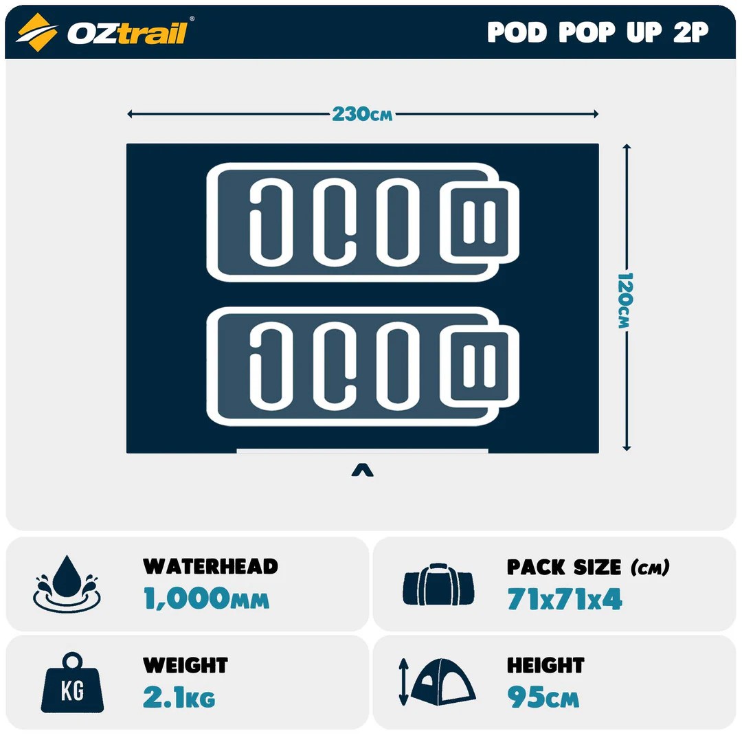 Για όσους προτιμούν μια ποιοτική αλλά εύκολη στη χρήση και προσιτή οικονομικά σκηνή 2 ατόμων η Oztrail παρουσιάζει την Pop Up Pod Tent 2P. H σκηνή της Oztrail ξεχωρίζει για την αποσπώμενη οροφή, την διάτρητη κατασκευή σε επιλεγμένα σημεία του υλικού και άνετο χώρο για δύο άτομα ενώ διαθέτει άπλετο χώρο και για την εναπόθεση των αποσκευών. Αποτελεί την ιδανική λύση για μικρές αποδράσεις όπου θέλουμε λιγότερες αποσκευές και εύκολη τοποθέτηση. Pop-up στύλ σκηνής με εύκολο ξεδίπλωμα/δίπλωμα και τοποθέτηση Αφαιρούμενο κάλυμμα που παρέχει επιπρόσθετη κάλυψη και προστασία από τη βροχή Μεγάλη είσοδος Διάτρητες στοχευμένα περιοχές στην επιφάνεια της οροφής για άριστο εξαερισμό Αυξημένη ευστάθεια σε περιπτώσεις έντονων αναταράξεων από δυνατό άνεμο Αδιαβροχοποίηση 1000mm Βάρος 2,1 κιλά Διαστάσεις συσκευασίας 4 x 71 x 71 εκ. Διαστάσεις εγκατεστημένης σκηνής 120 (Π) x 230 (Μ) x 95 (Υ) εκ.