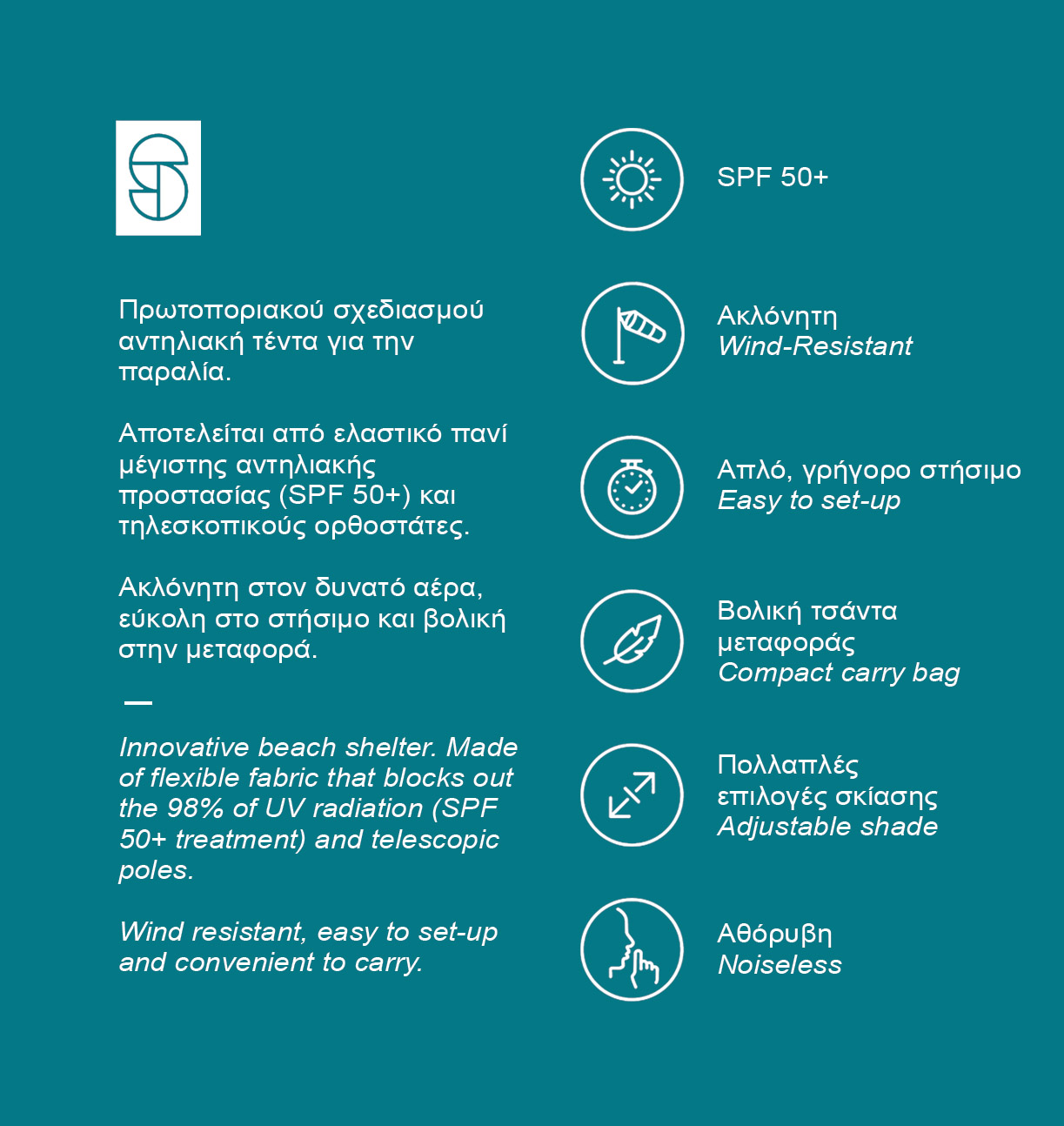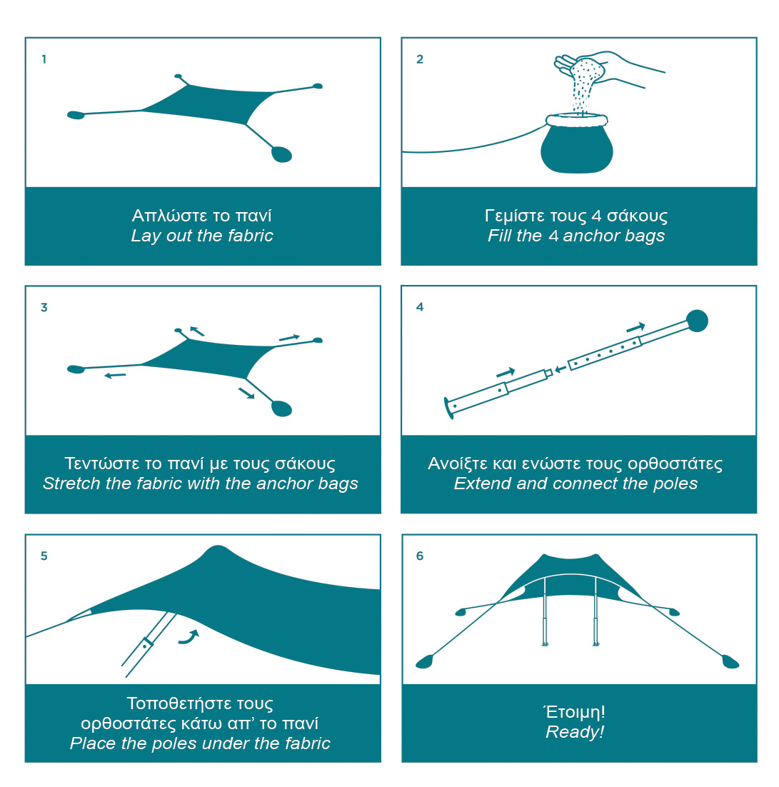 Πρωτοποριακού σχεδιασμού αντηλιακή τέντα Salty Tribe Aeolians. Αποτελείται από ελαστικό πανί μέγιστης αντηλιακής προστασίας SPF50+ , τηλεσκοπικούς ορθοστάτες αλουμινίου και σάκους αγκύρωσης. Ακλόνητη στον δυνατό αέρα, εύκολη στο στήσιμο και βολική στην μεταφορά. Ύφασμα Microfiber lycra με επεξεργασία SPF 50+, μπλοκάρει το 98% της υπεριώδους ακτινοβολίας. Αθόρυβο. Ενισχύσεις στα σημεία καταπόνησης. Προτυπωμένες οδηγίες συναρμολόγησης πάνω στο πανί. Ορθοστάτες Πτυσσόμενοι αλουμινίου ρυθμιζόμενου ύψους. Με αφρώδες άκρο για πολλαπλές κλίσεις – επιλογές σκίασης. Σάκοι Αγκύρωσης Από ενισχυμένο πολυεστερικό με επικάλυψη PVC για αντοχή στη φθορά. Σχοινιά πρόσδεσης με εντατήρες για ρύθμιση της απόστασης σάκων – τέντας. Με κρίκους για εύκολη και ασφαλή σύνδεση στην τέντα. Σάκος μεταφοράς Από ενισχυμένο πολυεστερικό με επικάλυψη PVC για αντοχή στη φθορά. Με βολικό ιμάντα μεταφοράς. Θήκη αποθήκευσης με φερμουάρ στο εσωτερικό. Διαστάσεις πανιού : 200 x 200 εκ. Διαστάσεις συσκευασίας : 60 x 14 x 14 εκ. Βάρος : 2.2 kg *Πλένεται στο πλυντήριο σε χαμηλή θερμοκρασία (30°C) χωρίς μαλακτικό Οδηγίες συναρμολόγησης Ενώστε τους σάκους με το πανί συνδέοντας τους κρίκους. Προσθέστε άμμο ή βότσαλα στους σάκους (σε δυνατό αέρα φροντίστε να είναι εντελώς γεμάτοι). Τεντώστε το πανί απομακρύνοντας τους σάκους. Ενώστε τους ορθοστάτες. Τοποθετήστε τους ορθοστάτες κάτω από το πανί για να δώσετε ύψος στην τέντα. ‘Ετοιμη! Σε συνθήκες ισχυρού ανέμου, ασφαλίστε τον ορθοστάτη με το έξτρα κορδόνι