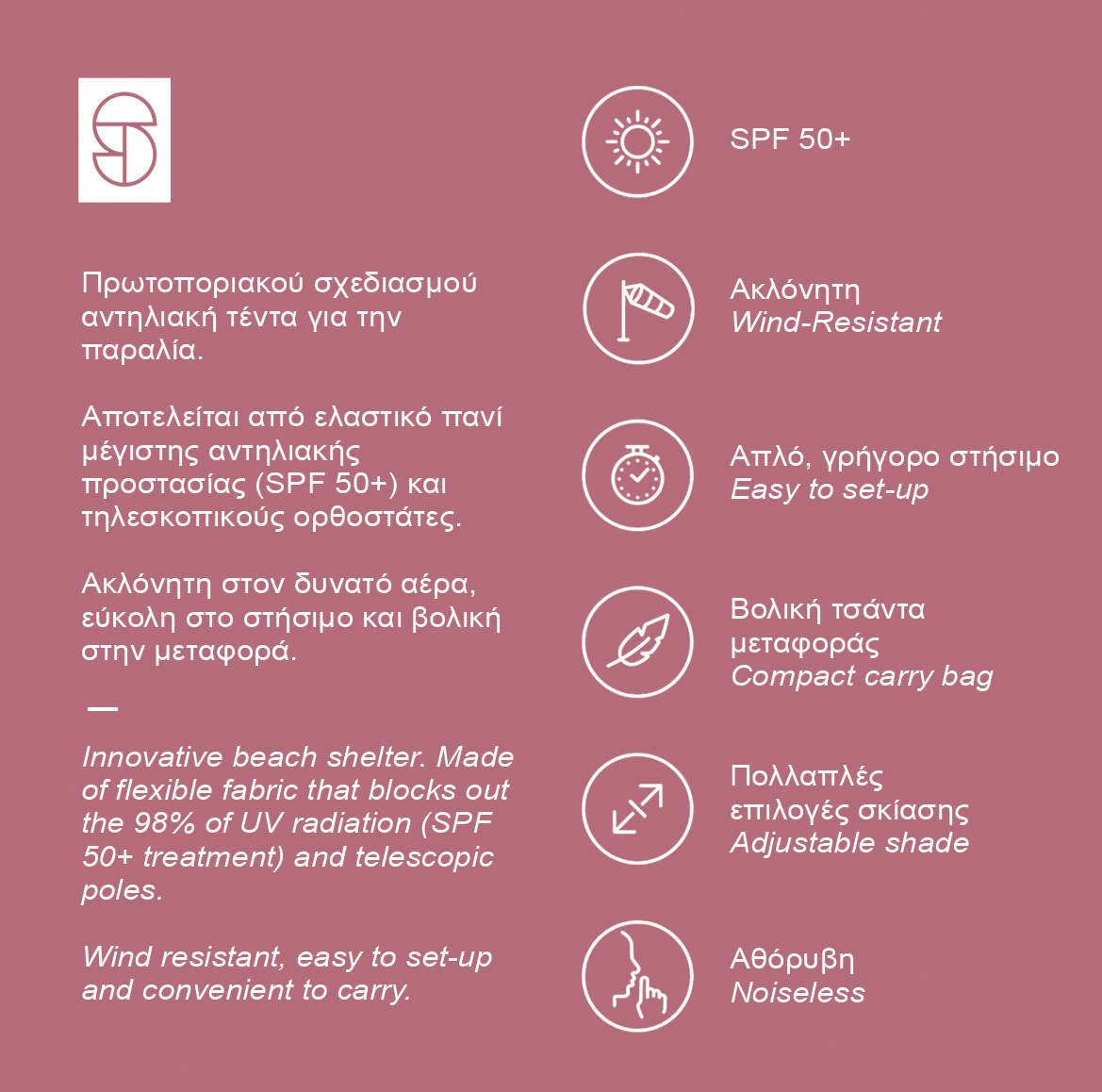 Πρωτοποριακού σχεδιασμού αντηλιακή τέντα Salty Tribe Aeolians. Αποτελείται από ελαστικό πανί μέγιστης αντηλιακής προστασίας SPF50+ , τηλεσκοπικούς ορθοστάτες αλουμινίου και σάκους αγκύρωσης. Ακλόνητη στον δυνατό αέρα, εύκολη στο στήσιμο και βολική στην μεταφορά. Ύφασμα Microfiber lycra με επεξεργασία SPF 50+, μπλοκάρει το 98% της υπεριώδους ακτινοβολίας. Αθόρυβο. Ενισχύσεις στα σημεία καταπόνησης. Προτυπωμένες οδηγίες συναρμολόγησης πάνω στο πανί. Ορθοστάτες Πτυσσόμενοι αλουμινίου ρυθμιζόμενου ύψους. Με αφρώδες άκρο για πολλαπλές κλίσεις – επιλογές σκίασης. Σάκοι Αγκύρωσης Από ενισχυμένο πολυεστερικό με επικάλυψη PVC για αντοχή στη φθορά. Σχοινιά πρόσδεσης με εντατήρες για ρύθμιση της απόστασης σάκων – τέντας. Με κρίκους για εύκολη και ασφαλή σύνδεση στην τέντα. Σάκος μεταφοράς Από ενισχυμένο πολυεστερικό με επικάλυψη PVC για αντοχή στη φθορά. Με βολικό ιμάντα μεταφοράς. Θήκη αποθήκευσης με φερμουάρ στο εσωτερικό. Διαστάσεις πανιού : 200 x 200 εκ. Διαστάσεις συσκευασίας : 60 x 14 x 14 εκ. Βάρος : 2.2 kg *Πλένεται στο πλυντήριο σε χαμηλή θερμοκρασία (30°C) χωρίς μαλακτικό   Οδηγίες συναρμολόγησης Ενώστε τους σάκους με το πανί συνδέοντας τους κρίκους. Προσθέστε άμμο ή βότσαλα στους σάκους  (σε δυνατό αέρα φροντίστε να είναι εντελώς γεμάτοι). Τεντώστε το πανί απομακρύνοντας τους σάκους. Ενώστε τους ορθοστάτες. Τοποθετήστε τους ορθοστάτες κάτω από το πανί για να δώσετε ύψος στην τέντα. ‘Ετοιμη! Σε συνθήκες ισχυρού ανέμου, ασφαλίστε τον ορθοστάτη με το έξτρα κορδόνι