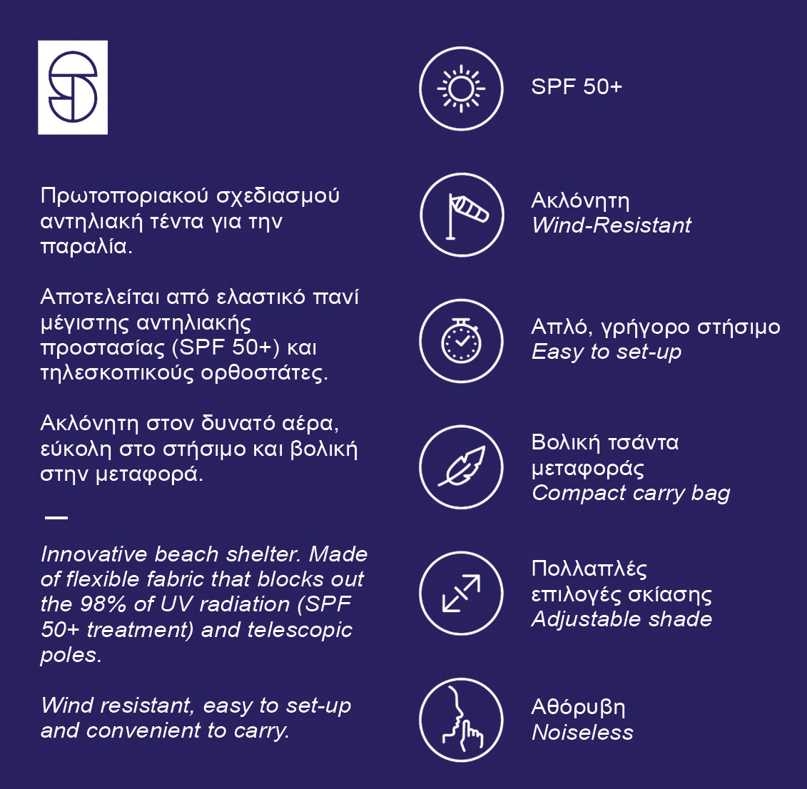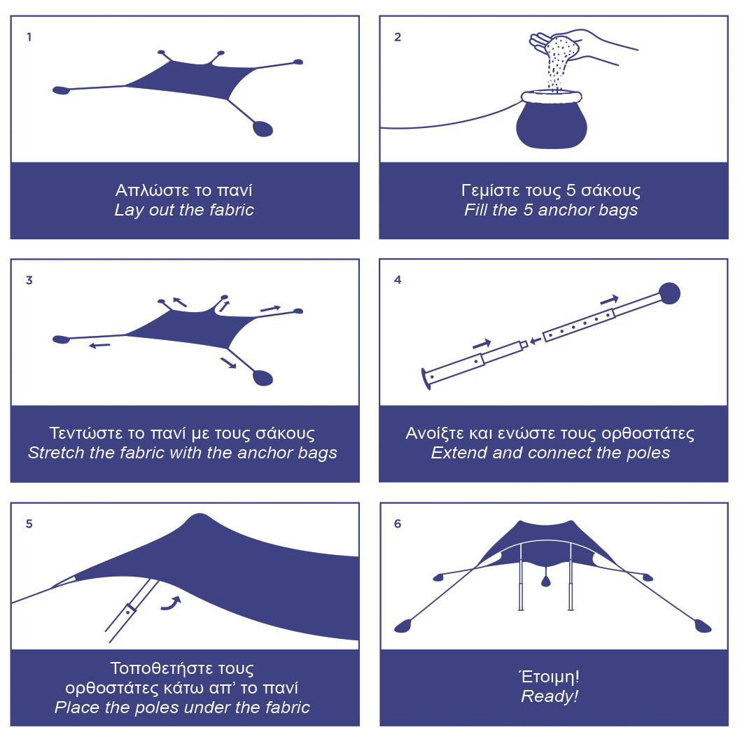 Ελαστική τέντα για την παραλία με υψηλή αντοχή στους ανέμους! • Εύκολη στην τοποθέτηση • Μικρό μέγεθος συσκευασίας• Υλικό: Microfiber lycra με επεξεργασία SPF 50+, μπλοκάρει το 98% της υπεριώδους ακτινοβολίας• Αθόρυβη ακόμα και όταν φυσάει πολύ• Με ενισχύσεις στα σημεία καταπόνησης• Με προτυπωμένες οδηγίες εγκατάστασης πάνω στο ύφασμα• Με 2 πτυσσόμενους ορθοστάτες αλουμινίου που ρυθμίζονται στο επιθυμητό ύψος• Με αφρώδες άκρο για πολλαπλές κλίσεις – επιλογές σκίασης• Περιλαμβάνονται 4 σάκοι που γεμίζουν με άμμο ή βότσαλα για την σταθεροποίηση της τέντας• 5 σάκοι αγκύρωσης για περισσότερη σταθερότητα.• Από ενισχυμένο πολυεστερικό με επικάλυψη PVC για αντοχή στη φθορά• Σχοινιά πρόσδεσης με εντατήρες για γρήγορη ρύθμιση της απόστασης σάκων – τέντας.• Με carabiner για εύκολη και ασφαλή σύνδεση στην τέντα.• Σάκος μεταφοράς• Από ενισχυμένο πολυεστερικό με επικάλυψη PVC για αντοχή στη φθορά.• Με ιμάντα μεταφοράς• Θήκη αποθήκευσης με φερμουάρ• Διαστάσεις πανιού: 300 x 250 cm• Διαστάσεις συσκευασίας: 60 x 17 x 17 cm• Βάρος: 3 kg *Πλένεται στο πλυντήριο σε χαμηλή θερμοκρασία (30°C) χωρίς μαλακτικό Σε συνθήκες ισχυρού ανέμου, ασφαλίστε τον ορθοστάτη με το έξτρα κορδόνι.