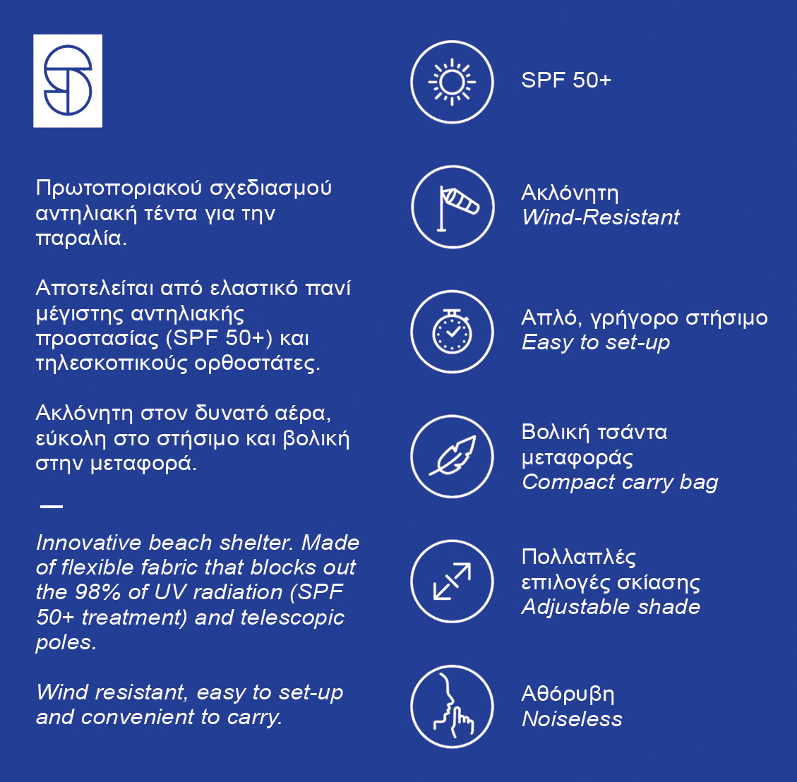 Ελαστική τέντα για την παραλία με υψηλή αντοχή στους ανέμους! • Εύκολη στην τοποθέτηση • Μικρό μέγεθος συσκευασίας• Υλικό: Microfiber lycra με επεξεργασία SPF 50+, μπλοκάρει το 98% της υπεριώδους ακτινοβολίας• Αθόρυβη ακόμα και όταν φυσάει πολύ• Με ενισχύσεις στα σημεία καταπόνησης• Με προτυπωμένες οδηγίες εγκατάστασης πάνω στο ύφασμα• Με 2 πτυσσόμενους ορθοστάτες αλουμινίου που ρυθμίζονται στο επιθυμητό ύψος• Με αφρώδες άκρο για πολλαπλές κλίσεις – επιλογές σκίασης• Περιλαμβάνονται 4 σάκοι που γεμίζουν με άμμο ή βότσαλα για την σταθεροποίηση της τέντας• 5 σάκοι αγκύρωσης για περισσότερη σταθερότητα.• Από ενισχυμένο πολυεστερικό με επικάλυψη PVC για αντοχή στη φθορά• Σχοινιά πρόσδεσης με εντατήρες για γρήγορη ρύθμιση της απόστασης σάκων – τέντας.• Με carabiner για εύκολη και ασφαλή σύνδεση στην τέντα.• Σάκος μεταφοράς• Από ενισχυμένο πολυεστερικό με επικάλυψη PVC για αντοχή στη φθορά.• Με ιμάντα μεταφοράς• Θήκη αποθήκευσης με φερμουάρ• Διαστάσεις πανιού: 300 x 250 cm• Διαστάσεις συσκευασίας: 60 x 17 x 17 cm• Βάρος: 3 kg *Πλένεται στο πλυντήριο σε χαμηλή θερμοκρασία (30°C) χωρίς μαλακτικό Σε συνθήκες ισχυρού ανέμου, ασφαλίστε τον ορθοστάτη με το έξτρα κορδόνι.