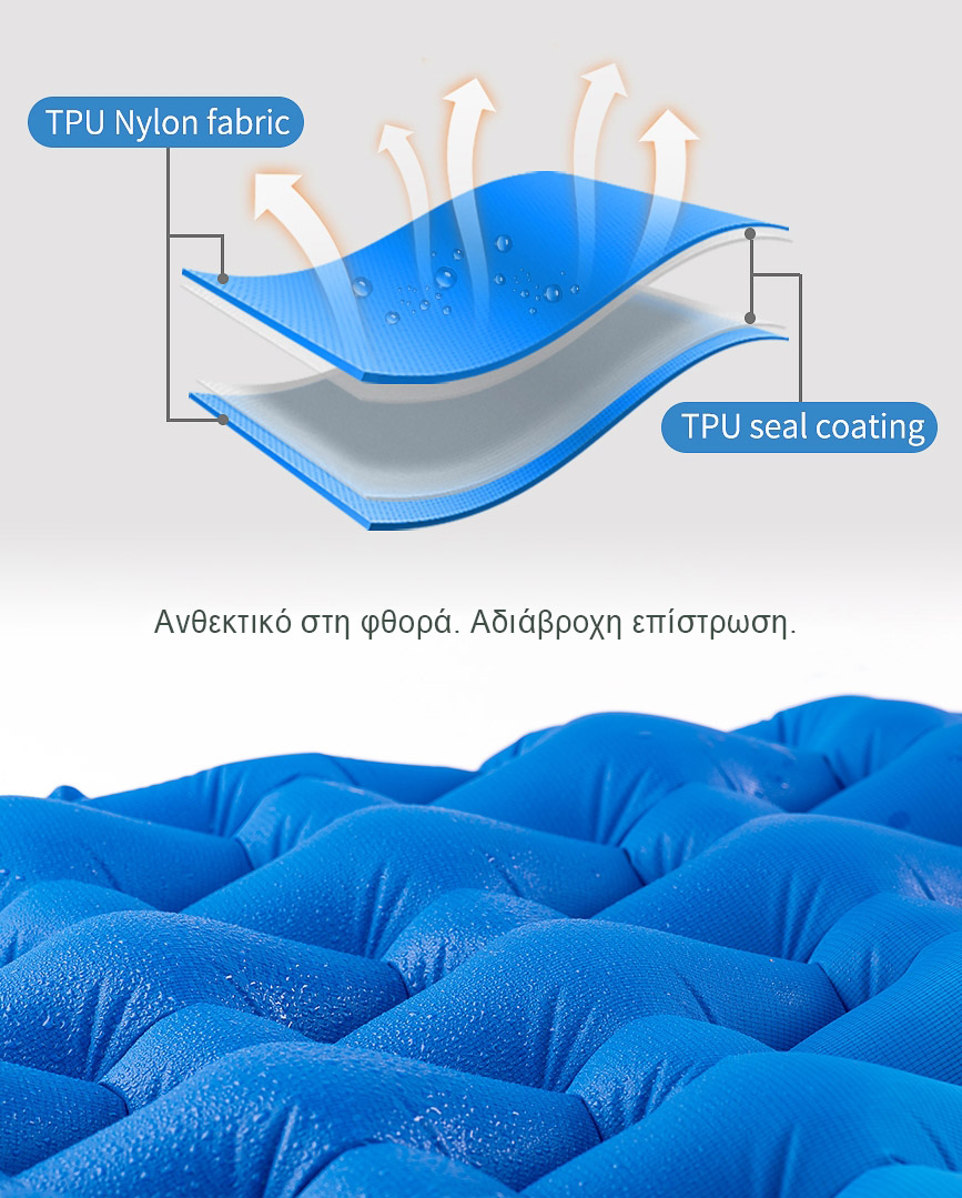 Χρησιμοποιήστε το φουσκωτό στρώμα Ciconians της Salty Tribe στο camping, στην πεζοπορία, στο σπίτι, και απολαύστε τον ύπνο σας σαν να είστε στο κρεβάτι σας. Είναι ελαφρύ και αρκετά μικρό για να το τοποθετήσετε στο σακίδιο σας. Χάρη στον καινοτόμο σχεδιασμό της 3D “κηρήθρας”, το στρώμα υποστηρίζει οποιοδήποτε βάρος χρήστη σε ολόκληρη την επιφάνεια του στρώματος, ανεξάρτητα από την στάση ύπνου, ενώ το πάχος των 6 cm προσφέρει μόνωση από το κρύο έδαφος. Ξεχάστε τα λεπτά στρώματα που σας προκαλούσαν πόνο στη πλάτη, μόλις κοιμηθείτε σε αυτό θα εύχεστε να το είχατε αποκτήσει πολύ νωρίτερα. Είναι κατασκευασμένο από ανθεκτικό – αδιάβροχο ύφασμα RIPSTOP, ικανό να σας συνοδεύσει σε κάθε είδους περιπέτεια στο βουνό. Η “έξυπνη” τσάντα μεταφοράς χρησιμοποιείται σαν αντλία αέρα έτσι ώστε να φουσκώνετε το στρώμα εύκολα, ενώ η διπλή βαλβίδα του στρώματος επιτρέπει το γρήγορο φούσκωμα και το ξεφούσκωμα. Χαρακτηριστικά: Διάσταση στρώματος: 185 x 55 x 5cm Διάσταση συσκευασίας: 15 x 8cm Βάρος: 700gr Ύφασμα: Nylon TPU Αδιάβροχη τσάντα μεταφοράς που χρησιμοποιείται και σαν αντλία αέρα. Διπλή βαλβίδα.