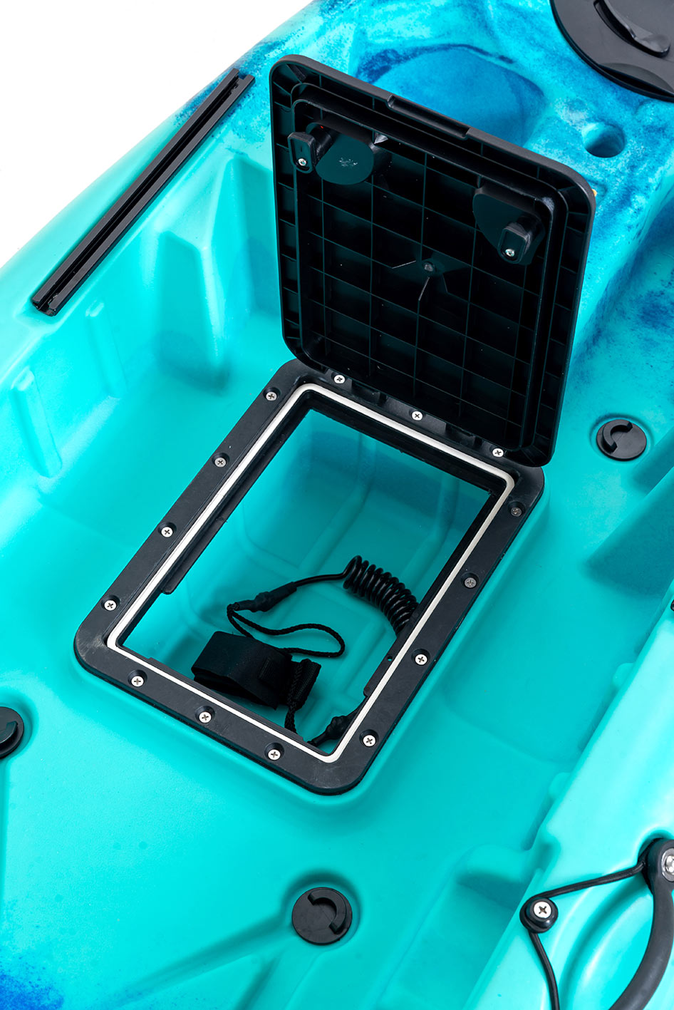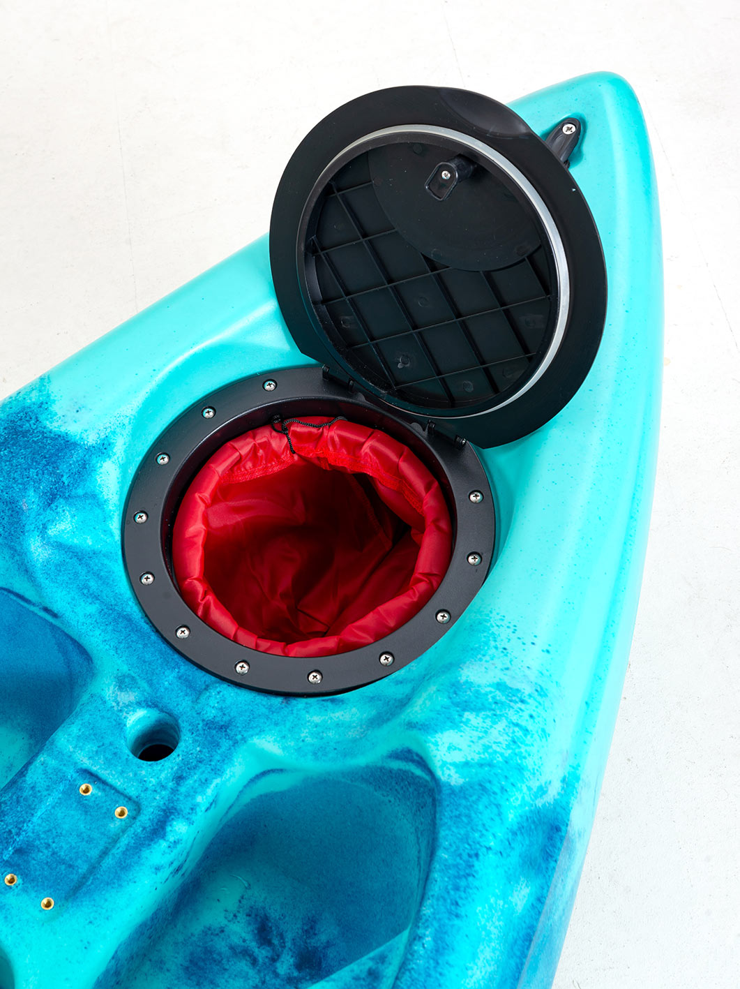 – Μία στρογγυλή στεγανή καταπακτή στην πλώρη με αποσπώμενη σακούλα, δίνει πρόσβαση στο εσωτερικό του καγιάκ και έχει διάμετρο 28 εκατοστά.
