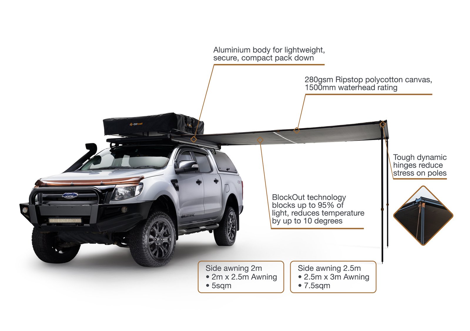 Η τέντα αυτοκινήτου BlockOut 2m x 2,5m της Oztrail είναι μια γρήγορη λύση έαν έχετε ένα μικρό όχημα και θέλετε μια καλή σκίαση δίπλα από αυτό. Κατασκευασμένο από βαρέως τύπου καμβά Ripstop 280 gsm, αδιαβροχοποίηση, και τεχνολογία BlockOut της OZtrail, μπλοκάρει έως και 95% την ηλιακή ακτινοβολία και μειώνει την θερμοκρασία κάτω από την τέντα έως και -10 °C, διατηρώντας σας δροσερό στη πολύ ζέστη και στεγνό σε μια βροχερή ημέρα. Οι ρυθμιζόμενοι πόλοι καθιστούν γρήγορη και εύκολη την τοποθέτησή της, ενώ οι σκληροί – δυναμικοί – μεντεσέδες μειώνουν την πίεση στους πόλους, ώστε να διασφαλίζουν την ανθεκτικότητά της και την χρήση της για πολλά χρόνια. Το μοναδικό σώμα αλουμινίου εξασφαλίζει σταθερότητα, ενώ στη συσκευασία περιλαμβάνεται και premium υλικό στερέωσης που ταιριάζει στις περισσότερες σχάρες οροφής. Χαρακτηριστικά: Το μοναδικό σώμα αλουμινίου εξασφαλίζει ασφάλεια και σταθερότητα Ύφασμα 280 g/m2 ripstop polycotton canvas βαρέως τύπου Αδιαβροχοποίηση 1500mm με θερμοκολλημένες ραφές Τεχνολογία Block Out, μειώνει τις θερμοκρασία έως και – 10 °C και μπλοκάρει το 95% της ηλιακής ακτινοβολίας Οι εξαιρετικά σκληροί & δυναμικοί μεντεσέδες μειώνουν την πίεση στους πόλους Περιλαμβάνει βραχίονες στήριξης και υλικό που ταιριάζει στα περισσότερα συστήματα σχάρας οροφής Μικρό μέγεθος συσκευασίας Κάλυψη τέντας: 2m x 2.5m (5 m2) Ύψος τέντας: 2.1m Διάσταση κλειστής: 2.04 x 0.13 x 0.13 m Βάρος 11.3 kg Κωδικός Κατασκευαστή: 10000718