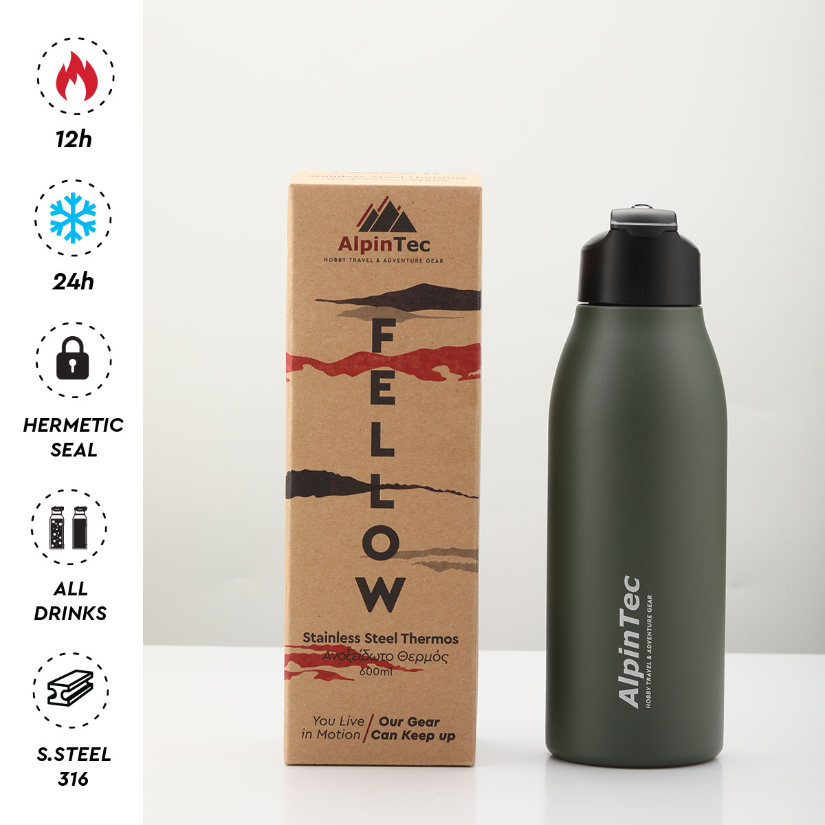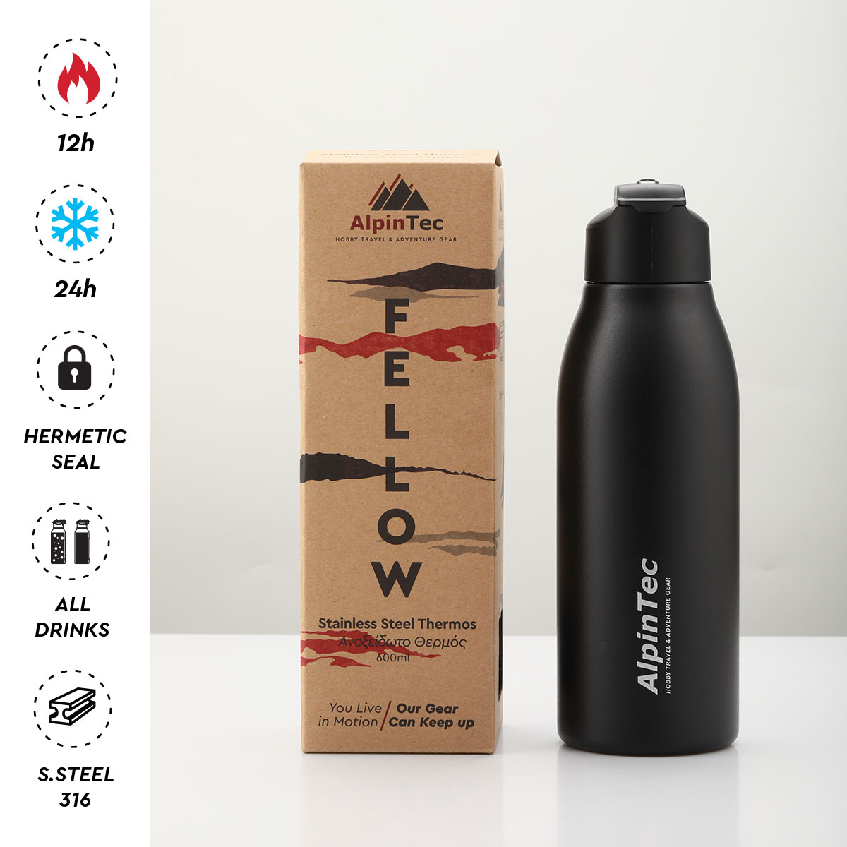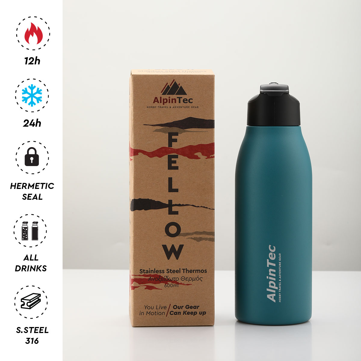 Το Θερμός της Alpintec Fellow διατηρεί τα ποτά σας κρύα για 24 ώρες και ζεστά για 12. Χωρίς υγρασία και με τέλειο μέγεθος για την άνετη ενυδάτωση σας.