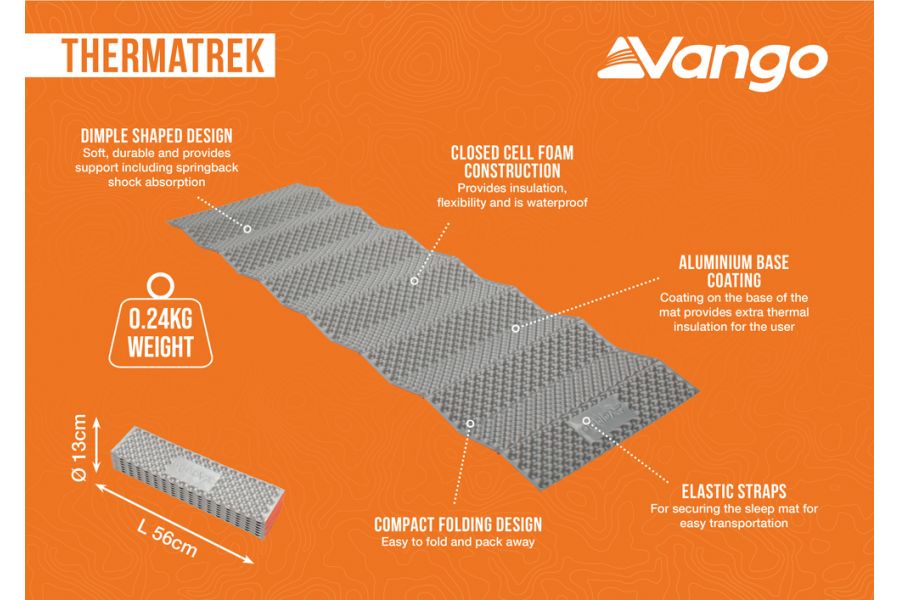 Το υπόστρωμα ύπνου Vango ThermaTrek είναι τέλειο για έναν ζεστό και άνετο ύπνο στις πεζοπορικές περιπέτειες με διανυκτέρευση, αφού σας διασφαλίσει πως θα σας προστατεύσει από το παγωμένο έδαφος. Η νέα κατασκευή Closed Cell διατηρεί τη θερμότητα και είναι εξαιρετικά αδιάβροχη, ενώ η επικαλυμμένη βάση από αλουμίνιο παρέχει πρόσθετη μόνωση για να αποκρούσει τις κρύες νύχτες. Η εύκολη αναδιπλούμενη δομή του κάνει τη μεταφορά απλή. Μείνετε ζεστοί και στεγνοί όπου κι αν πάτε και κοιμηθείτε καλύτερα με το υπόστρωμα ύπνου ThermaTrek. Χαρακτηριστικά: Βάρος: 235gr Διάσταση: 182 x 56 x 1.7 cm Συσκευασία: 56 x 8.8 x 13 cm Κωδικός Κατασκευαστή: SMRTHERMAO07Z06